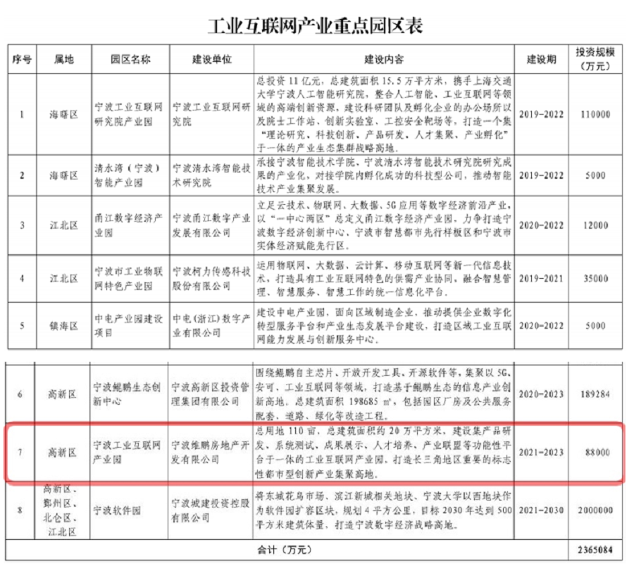 2021年7月2日,寧波市制造業(yè)發(fā)展高質(zhì)量領(lǐng)導(dǎo)小組辦公室印發(fā)關(guān)于《寧波市打造工業(yè)互聯(lián)網(wǎng)領(lǐng)軍城市建設(shè)方案》的通知,由維科集團房產(chǎn)事業(yè)部下屬寧波高新區(qū)云羿開發(fā)建設(shè)有限公司投資建設(shè)的高新項目(即寧波工業(yè)互聯(lián)網(wǎng)產(chǎn)業(yè)園)被該建設(shè)方案列為寧波市工業(yè)互聯(lián)網(wǎng)領(lǐng)域八個重點園區(qū)之一。