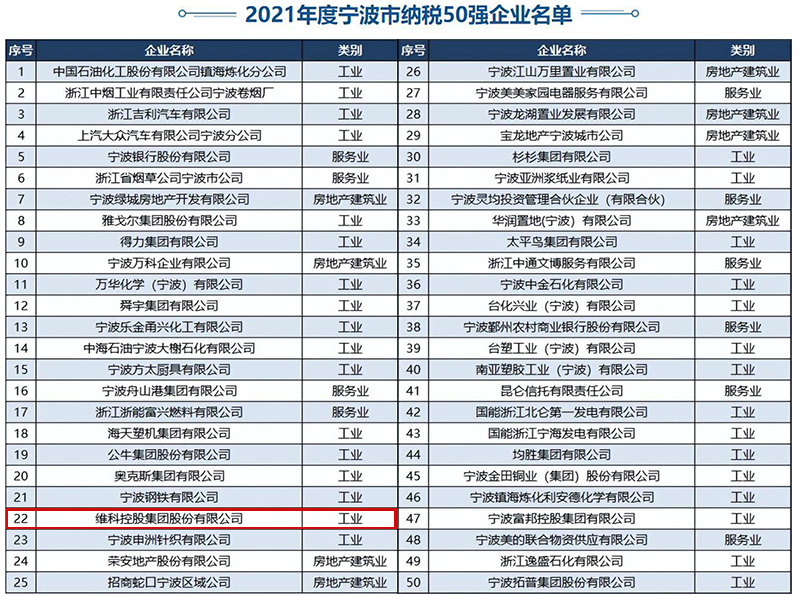 近日,寧波市經(jīng)濟(jì)和信息化局發(fā)布 “2021年度寧波市納稅50強(qiáng)企業(yè)”名單,維科集團(tuán)再次榮登榜單,位居第22位,比2020年度上升近20位。