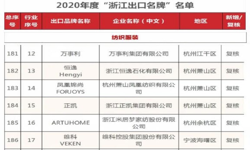 「Veken家庭用織物」ブランドが2019寧波ブランドトップ100入り