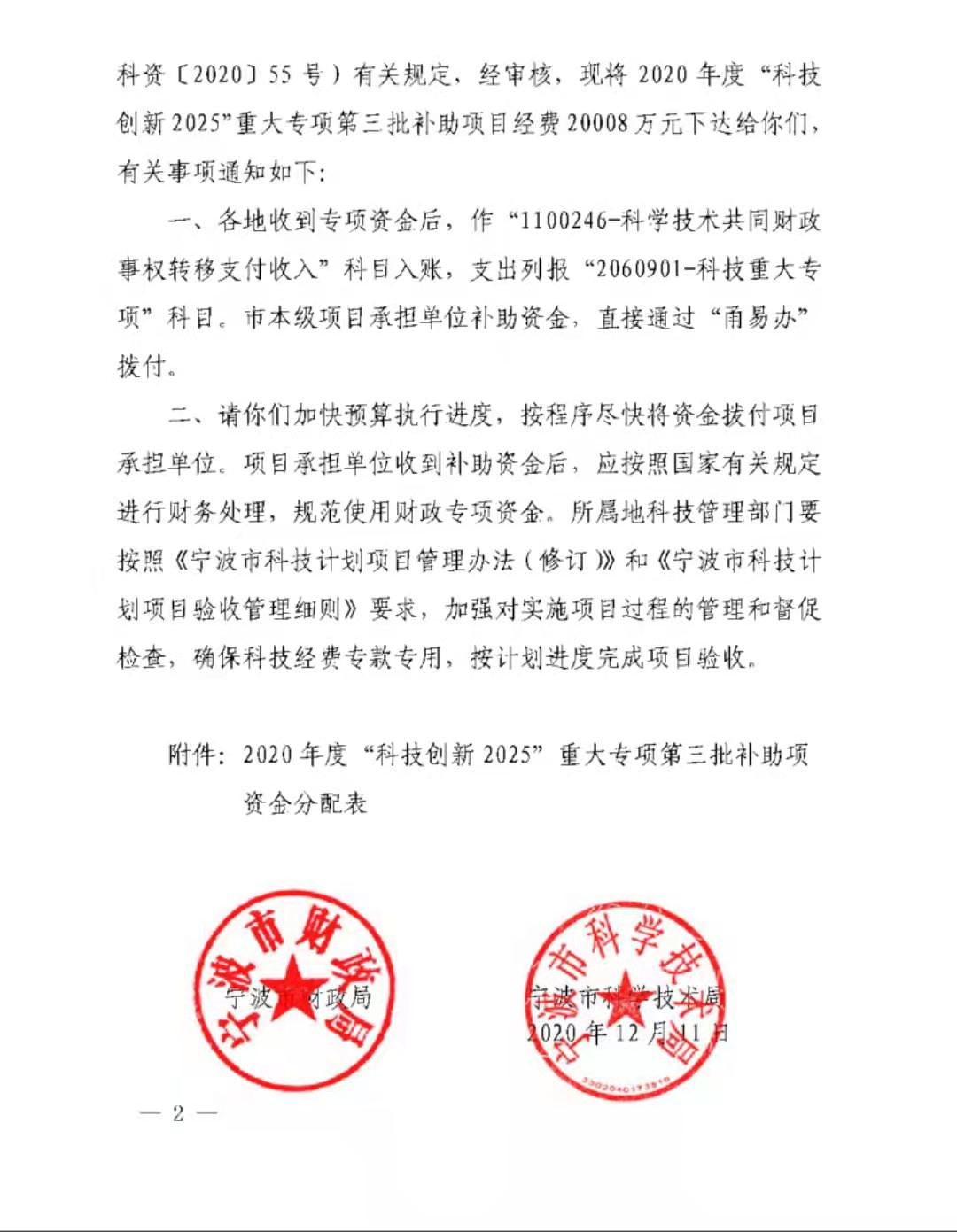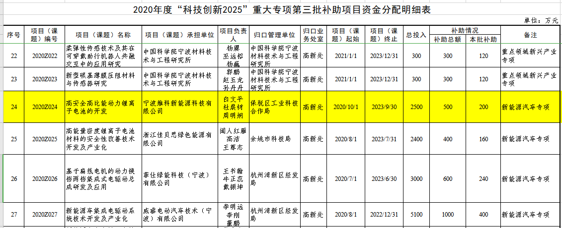 12月15日、寧波市財(cái)政局は「寧波市2020年科學(xué)技術(shù)発展特別基金(第3回バッチ補(bǔ)助金の主要特別プロジェクト)の発行に関する通知」(Ningbo Finance [2020] No.1214)を発行し、寧波VEKEN新エネルギーテクノロジー有限公司が宣言した「高安全?高比エネルギー動(dòng)力リチウムイオン電池の開(kāi)発」プロジェクトが採(cǎi)択された。 2020年に寧波市から「科學(xué)技術(shù)革新2025」大型特別プロジェクトの受注に成功し、第一期の補(bǔ)助金200萬(wàn)元を獲得した。