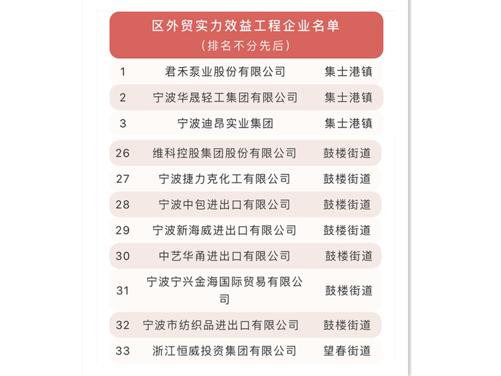 このリストに掲載された企業(yè)に対して、海曙區(qū)は國際貿(mào)易発展連盟を頼りに、通関、稅金の払い戻し、信用保険、融資、貿(mào)易救済などの重要なサポートを提供する。