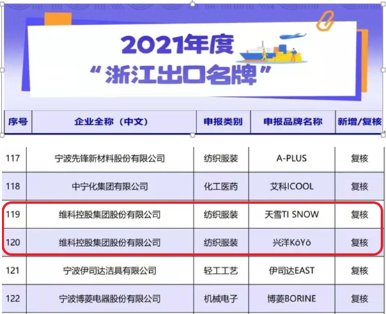 このほど、浙江省商務庁は、2021年度の「浙江輸出ブランド」のリストを発表した。維科グループ傘下の興洋KOYO、天雪TI SNOWの2つのブランドは順調に再審査を通過し、「浙江輸出ブランド」の栄譽を再獲得し、有効期間は3年(2022-2024年)である。