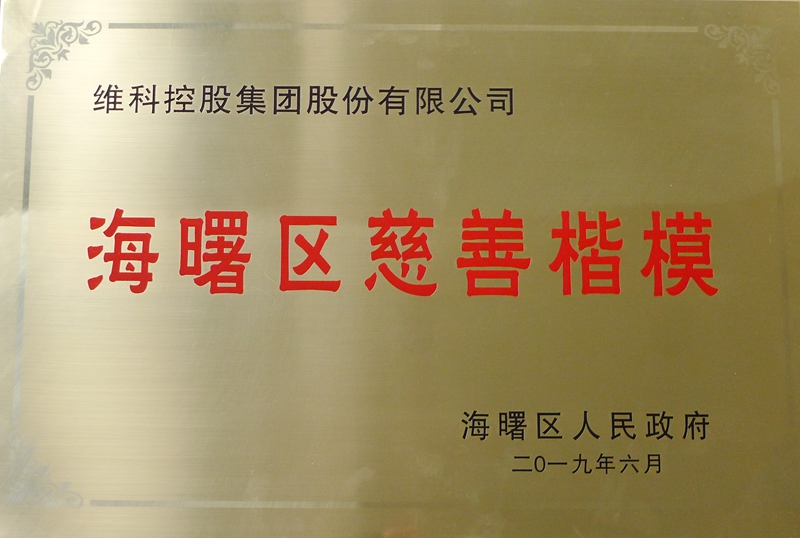 2019年6月11日午後、海曙區(qū)政府は2019年慈善活動會議を開催した。団結(jié)互助、貧困扶助の慈善文化を大いに発揚し、社會各界の公益に熱心で、貢獻に好む良好な気風(fēng)を唱道するため、會儀中海曙區(qū)人民政府は公益慈善分野で際立った貢獻をした企業(yè)?事業(yè)體、郷鎮(zhèn)、街道、コミュニティ及び個人を表彰し、維科持株グループ株式會社は「海曙區(qū)慈善模範(fàn)」の稱號を獲得した。
